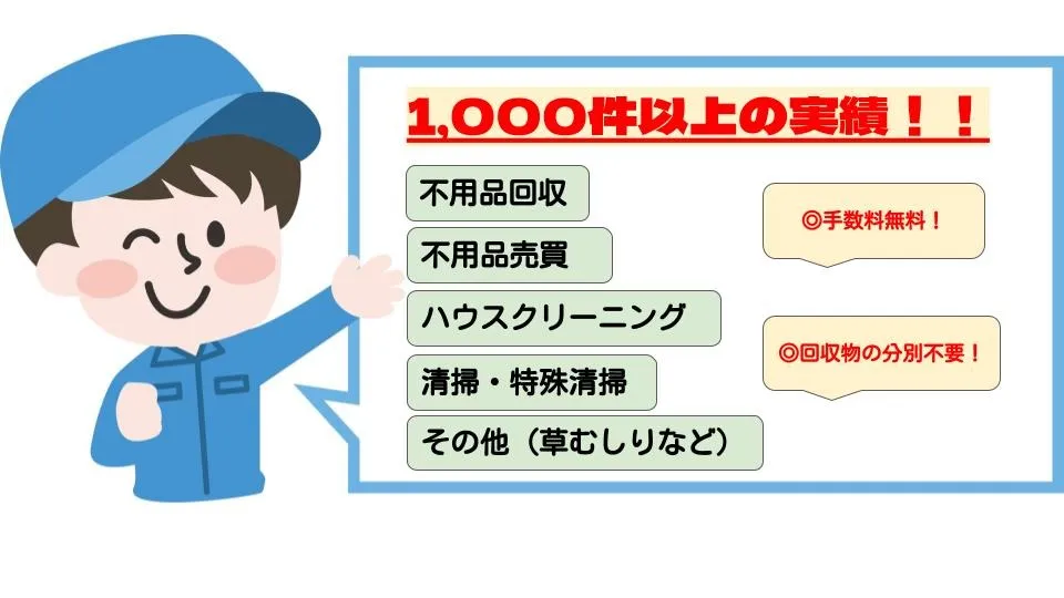 家の中がすっきりと片付く不用品回収を、大阪、兵庫エリアを中心に行っております。エアコン、テレビ、パソコンのモニター、扇風機など、買い替えやお引越しなどに伴って不要になった家電やその他小物も、1点から回収いたします。また、ご要望があればご自宅、店舗問わず片付けやハウスクリーニング、特殊清掃なども実施しております。安心してご依頼いただけるよう、お見積もりは無料です。現地にお伺いした上でのお見積もりはもちろん、お写真を拝見して金額をお出しいたしますので、ご検討の方は一度ご連絡ください。
